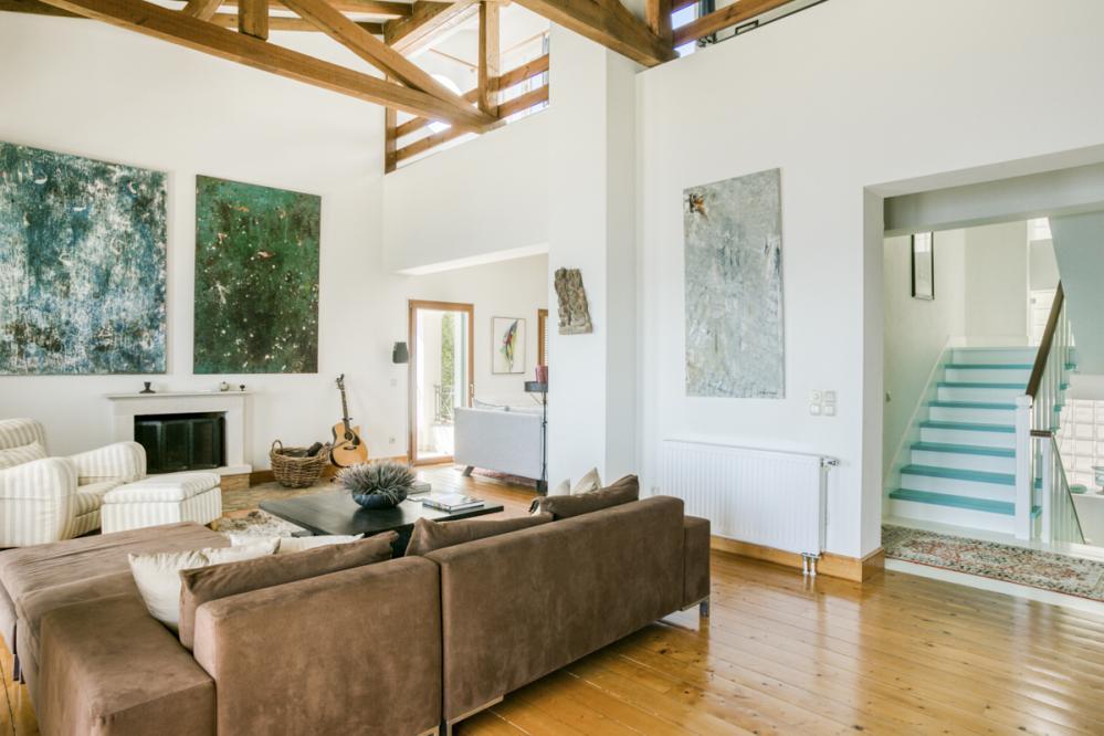 The main villa can comfortably house 11 guests and features bright and spacious living areas and inviting bedrooms. The intimate cottage can accommodate an additional 6 guests. The center of the villa revolves around the open-plan kitchen and dining area on the ground floor, painted in warm tones and equipped with picture frame windows that showcase the breathtaking landscape. The main living room, located on the first floor, boasts high ceilings, exposed beams, and large windows that let in an abundance of natural light. The space exudes effortless elegance and a relaxed atmosphere, complete with plush sofas that invite you to sink in. The turquoise stairs lead to a mezzanine level with a gallery view of the lounge and a private study.